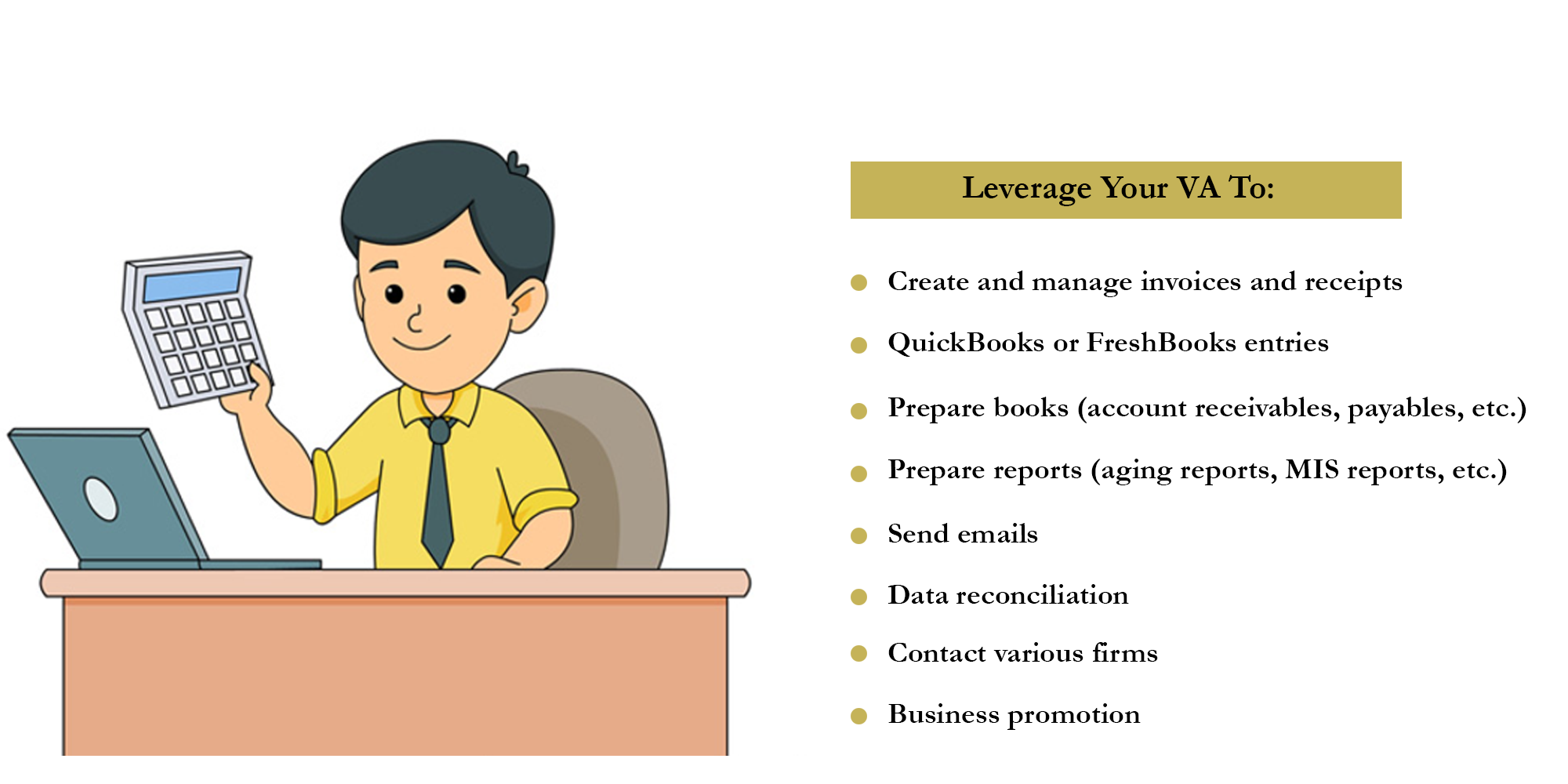 However, tasks like regular data entries, creating and managing invoices and receipts, making entries in QuickBooks or FreshBooks, preparing trial balance, managing account payables and receivables, prepare aging reports, MIS reports, and handling petty cash books, sending emails to your clients, data reconciliation, promoting your business digitally and so on, can easily be done by a virtual assistant.