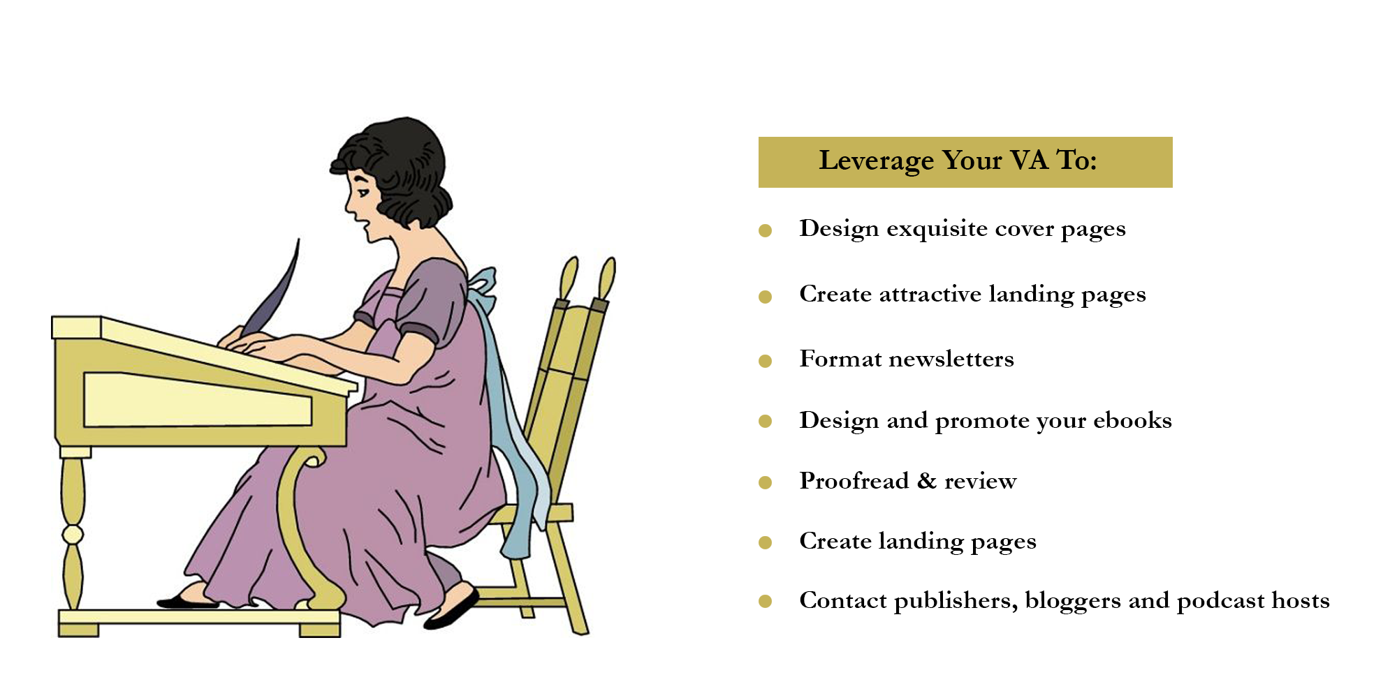 However, a VA can be of huge help to you! Ask your VA to design an exquisite cover page for your book, create attractive landing pages, format newsletters, design your ebook, prepare a strategy to market the book, scout and get in touch with various bloggers and ask for their reviews, compile a list of relevant podcasts where you can promote the book, help you with translating the book into different foreign languages. If you need help on how to get published online on platforms like KDP, your assistant can walk you through it.