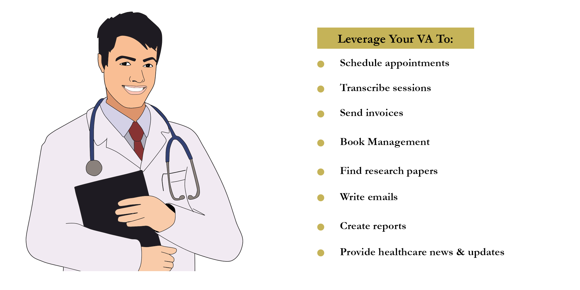 For instance, scheduling appointments, transcribing audio files of various counselling sessions, sending invoices to your clients, updating your booking slots online, helping you write and find various research papers by searching on Google Scholar, writing emails when you refer your patients to other doctors, formatting various reports, providing you with important medical and healthcare updates, contacting pathologists and so on could easily be done by a VA.