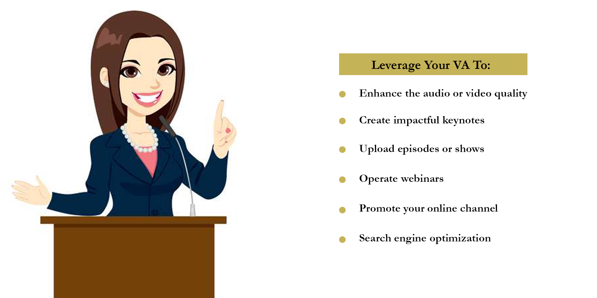 Your VAs can be of immense help by assisting to edit and enhance the audio or video quality, creating impactful keynotes, uploading the shows or webinars on your site or some other platform (e.g., YouTube), promoting your channel on Youtube and Facebook. Some VAs are exceptional digital marketers and can help enhance your channel by making use of SEO-friendly keywords, accurate descriptions and tags, etc.
