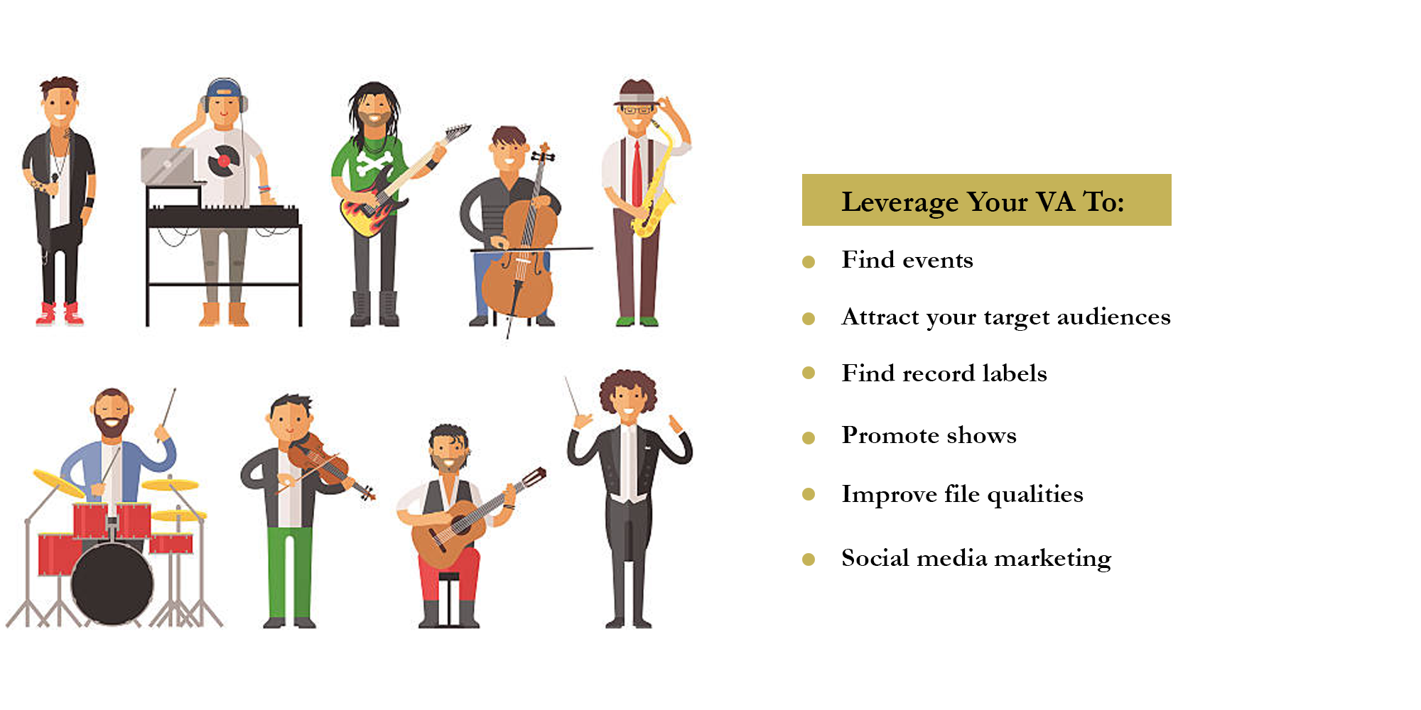But if you need help finding various musical shows and events in and around your locality, attracting your target audience to attend your shows, finding record labels, your VA is the right person to go about doing this for you.