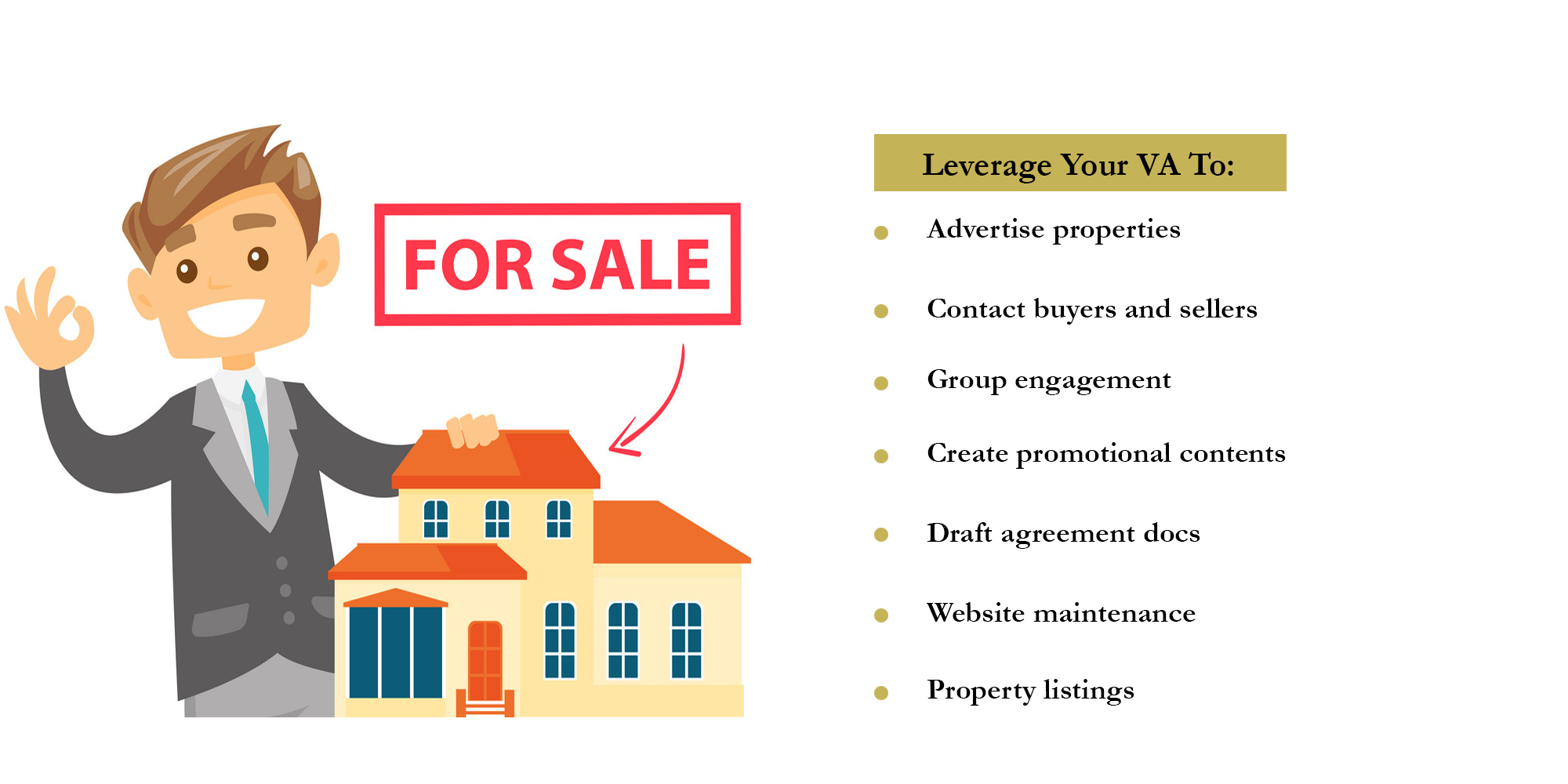 But, you can make use of your VAs by asking them to advertise/market your properties on social media. They could connect with potential buyers and sellers, join and engage on various relevant online groups, create promotional content like pamphlets, business cards, prepare property-related survey reports, newsletters, help the buyer craft their initial offer and purchase agreement, maintain your website, list properties on various sites such as Zillow, Trulia and so on