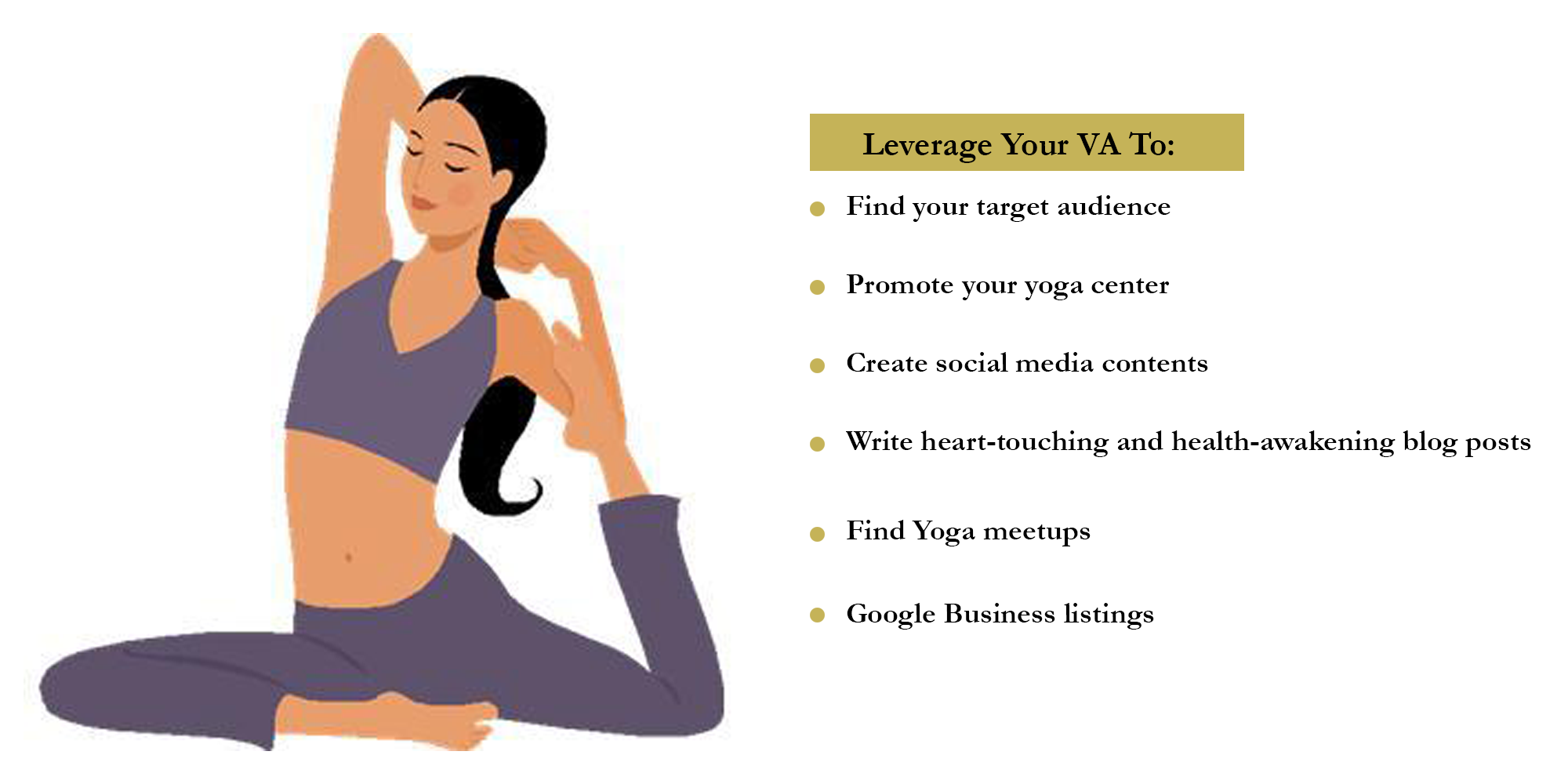 If you’re a yoga instructor, performing various asanas, teaching correct postures and balancing techniques are your work; however, tasks like finding people interested in “Yoga classes”, promoting your Yoga studio or center online, creating social media content, writing heart-touching and health-awakening blog posts, finding Yoga meetups in your city, listing your business on Google, can be assigned to your VAs.